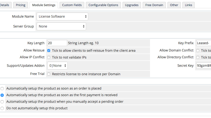 This addon includes many customization options to ensure your licensing system works for you. When you configure licensing for a product, you'll be able to set a key prefix and specific license key lengths. You'll also be able to set whether clients can self-reissue their licenses. For license requirements, you can choose whether to validate IP addresses, whether to allow domain and directory conflicts, and whether to include secret keys for MD5 verification. It has everything you need in a solution for SaaS-based products.